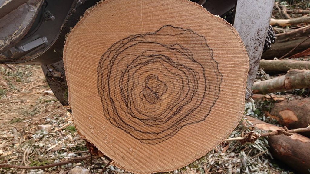 | カシの木を伐採したら下のような状態に(*゚ロ゚) カシではよくあるそうですが、年輪に沿って綺麗に エンピツでなぞった様な模様になっています。 この木が生長する過程で、黒くなっているところは 「何か!」があったのでしょう!病気だったのか はたまた、台風などで傷ついてしまったのか?? しかし、その困難を乗り越えて木は生長していきます。 私たちも今、苦難に見舞われています。 この木の様に私たちもこの苦難を乗り越え、 成長していかなくては!! |