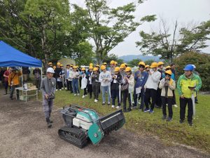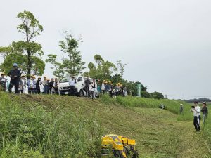 雨模様でしたが、研修中は止んで(さすが、晴れ男の社長!!)ラジコン草刈り機とウインチ付きラジコン草刈り機の2台の紹介ができました。