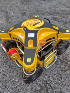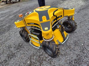 社長が即決して買ったスパイダーが納入されました。最初の草刈り機と違うのは、足回り。スピードもあります。ウインチ付きなので、急傾斜も難なく刈り取っていきます。