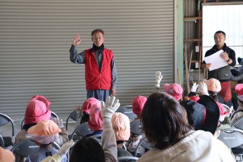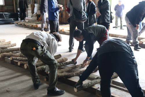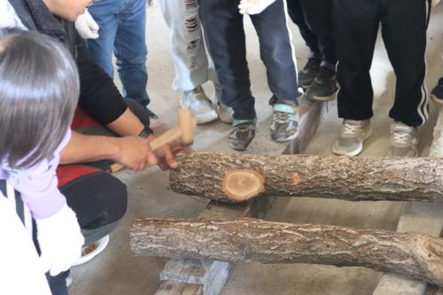 まず、県の指導林家で弊社社長より菌子の打ち方などの話をしたあと、6つのグループに分かれて、お父さんのようなお兄さんがお手本を見せてあげたら初めてのことだけどちゃんと順番に上手に打ち込んでいました。